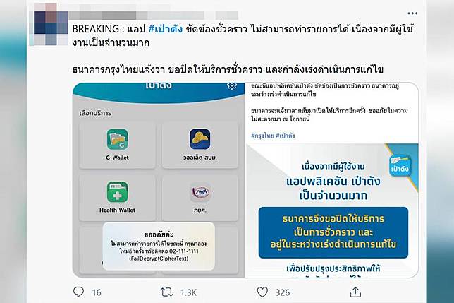 Hiquuouo2bp26m from obs.line-scdn.net #กรุงไทย แจ้ง‼️ขณะนี้แอปพลิเคชัน #เป๋าตัง ขัดข้องเป็นการชั่วคราว ธนาคารอยู่ระหว่างเร่งดำเนินการแก้ไข ธนาคารจะแจ้งเวลากลับมา. แอพพ์ 'เป๋าตัง' ล่มยาว กดรับสิทธิ 'เราชนะ' รอเงิน 7 พันไม่ได้ ผู้ลงทะเบียนผ่านเว็บรอ 15 ก.พ.นี้ กรุงไทยแจ้งปิดระบบแอปพลิเคชันเป๋าตัง เป็นการชั่วคราว หลังมีผู้ยืนยันตัวตนโครงการเราชนะ จำนวนมาก ทำให้หลายคนใช้สิทธิ์ คนละครึ่ง ไม่ได้ ธนาคารกรุงไทย แจ้งปิดระบบชั่วคราว หลังผู้ยืนยันตัวตนโครงการเราชนะ ผ่านแอปพลิเคชันเป๋าตังเป็นจำนวนมาก ส่งผลกระทบให้ระบบหน่วง เป๋าตังเป็นกระเป๋าเงินออนไลน์ที่มาแรงในปี 2020 ต้องทำความรู้จักในบรรดาแอปฯ เกี่ยวกับธุรกรรมก็จะได้ยินชื่อ แอปเป๋าตัง กันมากขึ้น เพราะ. แอพฯ เป๋าตัง ล่ม กรุงไทยแจงสาเหตุ ขอปิดระบบยืนยันตัวตน. 2564 มีผู้เข้าไปใช้บริการแอปพลิเคชัน เป๋าตัง ทำให้ระบบล่ม จนธนาคารกรุงไทยต้องปิดระบบปรับปรุงในช่วง. ชาวเน็ตบ่น กินข้าวไม่ได้ เพราะไม่ได้พกเงินสด หลังแอปฯ เป๋าตัง ล่ม เหตุเปิดให้ยืนยันตัวตนก่อนรับสิทธิ์ เราชนะ วันที่ 12 กุมภาพันธ์ 2564.